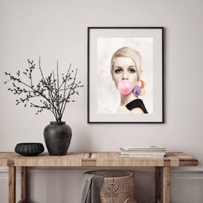 Quadro twiggy bubble gum - 60x48cm Moldura: madeira branca Informações do produto tire todas as suas dúvidas no descritivo abaixo: decoração para quarto, sala, cozinha, escritório, área gourmet e muito mais. Chega de paredes vazias medidas - cada peça tem 60x48cm . Material do papel - papel fotográfico brilhante de altíssima resolução acabamento - todos os quadros são acompanhados de vidro para proteção da imagem. - moldura em madeira maciça na cor preta ou branca conforme produto escolhido e pendurador. - paspatur branco com 7cm de largura - os quadros são embalados de forma segura com plástico bolha com camada dupla de acordo com o tamanho dos quadros. Garantia - garantia de 3 meses. Meu quadro chegou. Como posso fixá-lo Você precisa apenas de um martelo e um prego, pois os quadros já vão acompanhados de penduradores. Esta é a forma mais indicada. Como posso limpar meu quadro A limpeza é feita como um móvel comum da sua casa. Apenas um pano seco ou espanador são suficientes para tal