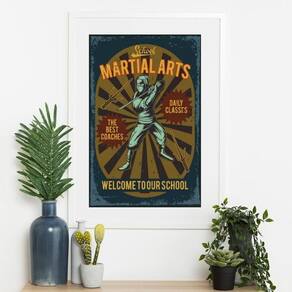 Quadro vintage artes marciais - 60x48cm Cor: moldura preta Informações do produto tire todas as suas dúvidas no descritivo abaixo: decoração para quarto, sala, cozinha, escritório, área gourmet e muito mais. Chega de paredes vazias medidas - cada peça tem 60x48cm . Material do papel - papel fotográfico brilhante de altíssima resolução acabamento - todos os quadros são acompanhados de vidro para proteção da imagem. - moldura em madeira maciça na cor preta ou branca conforme produto escolhido e pendurador. - paspatur branco com 7cm de largura - os quadros são embalados de forma segura com plástico bolha com camada dupla de acordo com o tamanho dos quadros. Garantia - garantia de 3 meses. Meu quadro chegou. Como posso fixá-lo Você precisa apenas de um martelo e um prego, pois os quadros já vão acompanhados de penduradores. Esta é a forma mais indicada. Como posso limpar meu quadro A limpeza é feita como um móvel comum da sua casa. Apenas um pano seco ou espanador são suficientes para tal