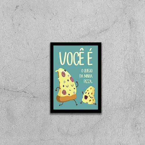 Quadro você é o queijo da minha pizza 24x18cm Moldura: madeira preta Informações do produto tire todas as suas dúvidas no descritivo abaixo: decoração para quarto, sala, cozinha, escritório, área gourmet e muito mais. Chega de paredes vazias medidas - cada peça tem 24x18cm a5 . Material do papel - papel fotográfico brilhante de altíssima resolução acabamento - todos os quadros são acompanhados de uma película de acetato para proteção da imagem. - moldura em madeira maciça na cor branca e pendurador móvel que pode ser retirado facilmente caso deseje fixar com fita dupla face. - os quadros são embalados de forma segura com plástico bolha com camada dupla de acordo com o tamanho dos quadros. Garantia - garantia de 3 meses prazo de envio pedimos 24 horas úteis no máximo para enviar seu pedido após o envio, segue os prazos normais dos correios, cerca de 7 dias úteis exceto para norte e nordeste, que pode ser de até 14 dias úteis. Em diversas cidades, este prazo normalmente é reduzido, mas depende do prazo dos correios. Meu quadro chegou. Como posso fixá-lo Você precisa apenas de um martelo e um prego, pois os quadros já vão acompanhados de penduradores. Esta é a forma mais indicada. Caso prefira, você pode utilizar uma fita dupla face neste caso, sugerimos de alta qualidade para evitar que descole e seu quadro caia . Como posso limpar meu quadro A limpeza é feita como um móvel comum da sua casa. Apenas um pano seco ou espanador são suficientes para tal
