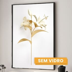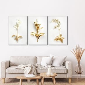 Quadro Decorativo Floral Delicado Flores Brancas e Douradas com 3 Telas para Sala, Quarto, Banheiro, Escritório, Hall, Hall de Entrada, Estúdio, Salão, Clínica.