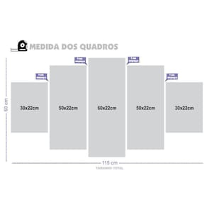 Kit 5 quadros decorativos mosaicos Material: Quadros produzido em mdf - dimensões: Tamanho total do quadro montado na parede: 115cm x 60cm - 1 peça central com 60x22cm - 2 peças intermediárias: 22x50cm - 2 peças laterais: 22x30cm. - deixar espaçamento entre as peças na hora da instalação = 1 cm -informações técnicas: O quadro não precisa de moldura, estão pronto para pendurar na parede. São feitos em adesivos fosco e impressos em alta qualidade. Aplicado em mdf com espessura de 3mm. - instalação: Não é necessário furar a parede para instalação, pois, enviamos fitas 3m com grande poder adesivo para facilitar a instalação. É necessário na hora da instalação posicionar o quadro em 1cm de largura entre eles para melhor qualidade de visualização. Limpe o local que vai ser instalado o quadro com um pano úmido, após secar o local, visualize como Vai ser o alinhamento, e retire a proteção da fita dupla face parte verde da fita e pressione No lugar desejado para a fixação. - limpeza após instalação: A limpeza pode ser realizada apenas com um pano seco macio, se desejar pode ser úmido porém sem conter álcool ou produtos químicos. Ean: 1001001061273