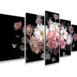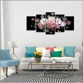 Conjunto 05 Quadros. Tamanho total: 115cm(comprimento)X60cm(altura) Peças menores: 02 unidades - 22x35 cm Peças médias: 02 unidades - 22x50 cm Peça central: 01 unidade - 22x60 cm Espaçamento entre as peças: 2 cm Não acompanha Vidro.