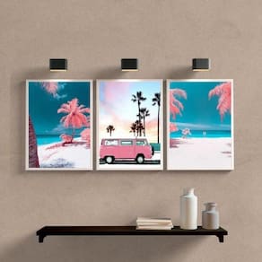 Especificações Técnicas: - Título: Kit 3 Quadros Decorativos Praia Kombi Rosa 45X34Cm - Vidro - Medidas: 45x34cm A3 cada peça - Material do papel: Papel fotográfico brilhante de altíssima resolução - Moldura: Madeira branca - Acompanha vidro para proteção da imagem - Penduradores já inclusos - Embalagem segura com plástico bolha - Garantia de 3 meses