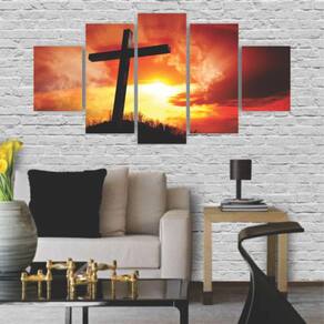 Quadros Decorativos Religioso Por Do Sol Cruz Kit 5 quadros decorativos mosaicos Material: Quadros produzido em mdf - dimensões: Tamanho total do quadro montado na parede: 115cm x 60cm - 1 peça central com 60x22cm - 2 peças intermediárias: 22x50cm - 2 peças laterais: 22x30cm. - deixar espaçamento entre as peças na hora da instalação = 1 cm -informações técnicas: O quadro não precisa de moldura, estão pronto para pendurar na parede. São feitos em adesivos fosco e impressos em alta qualidade. Aplicado em mdf com espessura de 3mm. - instalação: Não é necessário furar a parede para instalação, pois, enviamos fitas 3m com grande poder adesivo para facilitar a instalação. É necessário na hora da instalação posicionar o quadro em 1cm de largura entre eles para melhor qualidade de visualização. Limpe o local que vai ser instalado o quadro com um pano úmido, após secar o local, visualize como Vai ser o alinhamento, e retire a proteção da fita dupla face parte verde da fita e pressione No lugar desejado para a fixação. - limpeza após instalação: A limpeza pode ser realizada apenas com um pano seco macio, se desejar pode ser úmido porém sem conter álcool ou produtos químicos. -demais dúvidas estamos à disposição, basta nos chamar no campo mensagens que estamos aqui para melhor atendê-los : Boas compras
