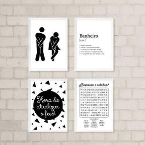 Especificações técnicas: - Kit com 4 quadros divertidos para banheiro - Medidas de cada peça: 24x18cm tamanho A5 - Moldura em madeira preta - Acompanha vidro para proteção da imagem - Penduradores já inclusos - Material do papel: papel fotográfico brilhante de altíssima resolução - Garantia de 3 meses