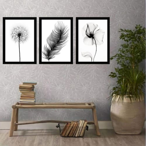O Kit 3 Quadros Minimalistas Flores E Penas 24X18Cm - Vidro é perfeito para decorar qualquer ambiente, seja quarto, sala, cozinha, escritório, área gourmet e muito mais. Com moldura de madeira branca, esses quadros minimalistas trazem elegância e sofisticação para o ambiente.