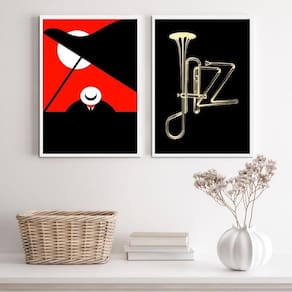 Garanta já o seu Kit 2 Quadros Decorativos Jazz Preto e Vermelho 45x34cm e transforme sua decoração com muito estilo e bom gosto!