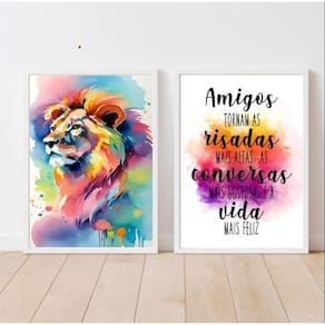 Kit 2 Quadros Decorativos Leão Frase Amigos 24X18Cm - Vidro O Kit 2 Quadros Decorativos Leão Frase Amigos é perfeito para decorar diversos ambientes, como quarto, sala, cozinha, escritório, área gourmet e muito mais. Chega de paredes vazias! Cada peça do kit possui medidas de 24x18cm A5 e é produzida com material de alta qualidade. O papel utilizado é fotográfico brilhante de altíssima resolução, garantindo uma imagem nítida e de ótima definição. Além disso, os quadros são acompanhados de vidro, que protege a imagem, e possuem moldura em madeira maciça na cor preta, o que confere um toque elegante e sofisticado à decoração. A fixação dos quadros é fácil e prática. Eles já vêm acompanhados de penduradores, ou seja, você só precisa de um martelo e um prego para colocá-los na parede. É a forma mais indicada e segura de fixação. A limpeza dos quadros é simples e rápida. Basta utilizar um pano seco ou um espanador, como você faria com qualquer outro móvel da sua casa. Garanta já o seu Kit 2 Quadros Decorativos Leão Frase Amigos e deixe sua casa ainda mais bonita e personalizada. Com excelente qualidade de impressão, durabilidade e design moderno, esses quadros são ideais para quem busca uma decoração única e cheia de estilo. Características técnicas: - Kit com 2 quadros decorativos - Tamanho de cada quadro: 24x18cm A5 - Material do papel: papel fotográfico brilhante de altíssima resolução - Acompanha vidro para proteção da imagem - Moldura em madeira maciça na cor preta - Penduradores inclusos para facilitar a fixação - Embalagem segura com plástico bolha para proteção durante o transporte - de 3 meses 1. Os quadros vêm prontos para pendurar? Sim, os quadros já vêm acompanhados de penduradores, o que facilita a fixação na parede. Você só precisa de um martelo e um prego para colocá-los no local desejado. 2. Como faço para limpar os quadros? A limpeza dos quadros é simples. Basta utilizar um pano seco ou um espanador para remover o pó. Evite o uso de produtos químicos ou água, pois podem danificar a imagem. 3. Qual é o tamanho de cada quadro? Cada quadro possui medidas de 24x18cm A5 , o que os torna ideais para compor uma galeria de quadros ou decorar espaços menores. 4. Os quadros são embalados de forma segura? Sim, os quadros são embalados com plástico bolha, em camada dupla, de acordo com o tamanho, garantindo a proteção durante o transporte. Dessa forma, você recebe os quadros em perfeito estado. Adquira agora mesmo o Kit 2 Quadros Decorativos Leão Frase Amigos e transforme a decoração da sua casa com estilo e personalidade!