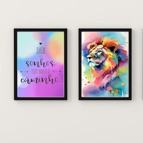 O Kit 2 Quadros Leão Aquarela Siga Seus Sonhos 45X34Cm - Vidro é perfeito para quem busca uma decoração elegante e inspiradora para diversos ambientes, como quarto, sala, cozinha, escritório e área gourmet. Com medidas de 45x34cm A3 , cada peça é produzida em papel fotográfico brilhante de altíssima resolução, garantindo uma imagem nítida e de qualidade.