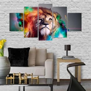 Quadros Mdf Leão De Judá Em Chamas Colorido Sala Quarto Kit 5 quadros decorativos mosaicos Material: Quadros produzido em mdf - dimensões: Tamanho total do quadro montado na parede: 115cm x 60cm - 1 peça central com 60x22cm - 2 peças intermediárias: 22x50cm - 2 peças laterais: 22x30cm. - deixar espaçamento entre as peças na hora da instalação = 1 cm -informações técnicas: O quadro não precisa de moldura, estão pronto para pendurar na parede. São feitos em adesivos fosco e impressos em alta qualidade. Aplicado em mdf com espessura de 3mm. - instalação: Não é necessário furar a parede para instalação, pois, enviamos fitas 3m com grande poder adesivo para facilitar a instalação. É necessário na hora da instalação posicionar o quadro em 1cm de largura entre eles para melhor qualidade de visualização. Limpe o local que vai ser instalado o quadro com um pano úmido, após secar o local, visualize como Vai ser o alinhamento, e retire a proteção da fita dupla face parte verde da fita e pressione No lugar desejado para a fixação. - limpeza após instalação: A limpeza pode ser realizada apenas com um pano seco macio, se desejar pode ser úmido porém sem conter álcool ou produtos químicos. -demais dúvidas estamos à disposição, basta nos chamar no campo mensagens que estamos aqui para melhor atendê-los : Boas compras Marca: Não Informado