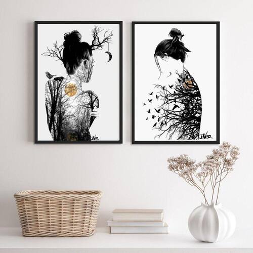 Garanta agora mesmo o Kit 2 Quadros Mulheres Árvores Pássaros Lua e transforme a decoração da sua casa com muito charme e estilo.
