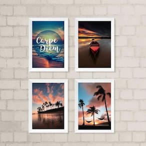 O Kit 4 Quadros Praia Por Do Sol Carpe Diem é perfeito para decorar o seu ambiente com muito estilo e bom gosto. Cada peça possui dimensões de 45x34cm, o que as torna ideais para compor a decoração de quartos, salas, cozinhas, escritórios, áreas gourmet e muito mais.