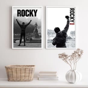 Especificações técnicas: - Título: Kit 2 Quadros Rocky Balboa Preto e Branco 33x24cm - Material da moldura: Madeira preta - Medidas de cada quadro: 33x24cm A4 - Material do papel: Papel fotográfico brilhante de altíssima resolução - Acabamento: Película de acetato para proteção da imagem - Acompanha penduradores - Garantia: 3 meses
