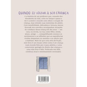 Quando eu voltar a ser criança é a história de um professor que, cansado dos dissabores da vida, volta no tempo e passa a ver e a sentir o mundo com olhos e coração de criança, mas retendo suas memórias de adulto. Com sensibilidade, delicadeza e ternura, Janusz Korczak nos convida a acompanhar situações do cotidiano dessa criança de dez anos — em casa, na escola, na rua; como filho, irmão, aluno, amigo —, compartilhando conosco os sentimentos e as reflexões que as experiências vividas despertam no menino e no adulto que a habitam. Mais do que uma obra de ficção, este livro é um ensaio sobre como é ser criança num mundo feito por e para adultos, e uma comovente apologia do direito das crianças a uma vida livre e feliz. Publicado em 1926, continua atual e extremamente necessário.