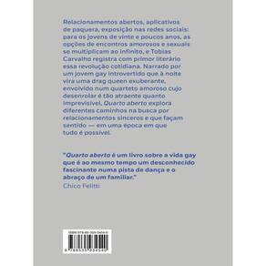 Relacionamentos abertos, aplicativos de paquera, exposição nas redes sociais: para os jovens de vinte e poucos anos, as opções de encontros amorosos e sexuais se multiplicam ao infinito, e Tobias Carvalho registra com primor literário essa revolução cotidiana. Narrado por Artur, um jovem gay introvertido que às noites vira uma drag queen exuberante, Quarto aberto conta a história de uma reviravolta pessoal inesperada. Quando Artur se reconecta com Eric, um garoto com quem se envolvera anos antes, este agora está em um relacionamento aberto com Antônio, jovem rico de beleza padrão com quem Artur começa a se relacionar. A vida estável do narrador passa a expor trincas e rachaduras quando Caíque, seu namorado, também entra na equação, transformando o triângulo amoroso em algo ainda mais complexo. Tobias Carvalho retoma com maturidade suas investigações literárias sobre a homossexualidade masculina em tempos de aplicativos de sexo, tema de sua obra de estreia. Dotado de uma prosa seca que remete ao mesmo tempo ao estilo pop de Sally Rooney e aos diálogos elípticos de Raymond Carver, Quarto aberto mostra, sem moralismo, a complexidade dos relacionamentos de uma geração de vinte e poucos anos para a qual todas as opções se revelam disponíveis e sedutoras.