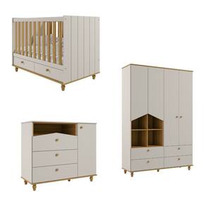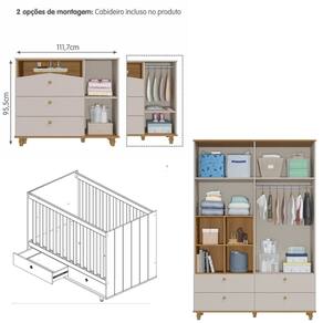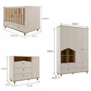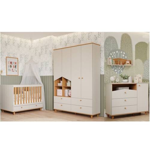 O Quarto Bebê Berço,Cômoda e Guarda Roupa Casinha Permobili é um conjunto lúdicos e funcionais, ideal para organizar e decorar com charme e elegância. Inclui roupeiro, cômoda e berço, todos fabricados em MDF 100, com design ecológico, seguro e durável. Destacam-se pelos detalhes como nichos decorativos, puxadores e pés torneados em madeira maciça, gavetas com corrediças telescópicas para deslizamento suave e amplo espaço interno. Acabamento em laca e tinta atóxica oferece segurança e sofisticação. Certificados pelo INMETRO BRE-637/2018-4, garantem resistência e estabilidade, atendendo às normas de segurança ABNT.