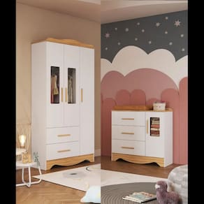 O Armário Clara 3 Portas Lisas Plus é um produto 100% MDF e possui pintura atóxica. Sua estrutura é fabricada em chapa de 12 mm, sendo seu tampo superior em chapa de 15 mm. Possui puxadores em MDF revestido com papel melamínico, cabideiro metálico e gavetas com corrediças telescópicas. Acompanha dois modelos de rodapés que podem ser definidos no momento da montagem.
