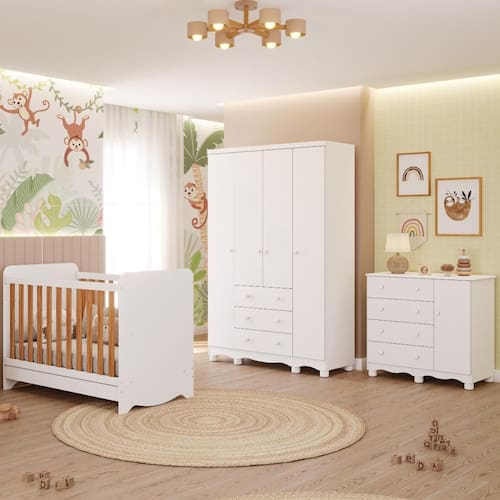 Conforto, aconchego, praticidade e segurança são itens fundamentais na escolha dos móveis do quarto para o seu Bebê e todos esses requisitos, você encontra no Quarto de Bebê Completo Berço Americano Ben 3 Em 1 Guarda Roupa 4 Portas e Cômoda Junior 4 Gavetas Móveis Peroba.