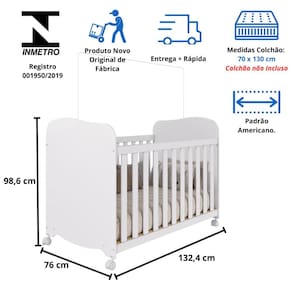 Dimensões do berço montado: Altura 98 cm x Largura 132 cm x Profundidade: 76 cm