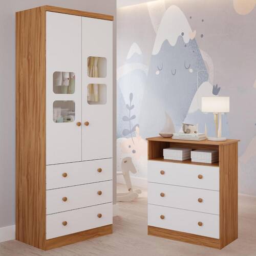 Torne seu ambiente aconchegante, prático e funcional com o Quarto de Bebê Completo: Gaveteiro Smim com 3 gavetas e Guarda-Roupa Uli com 2 portas e 3 gavetas da Móveis Peroba. Este compacto e encantador conjunto reúne beleza, qualidade e segurança em um design harmonioso.