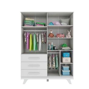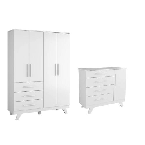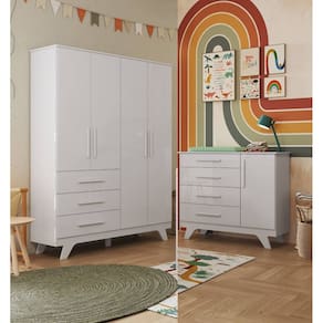 O Armário Retrô 4 Portas é um produto 100% MDF e possui pintura atóxica. Seu caixote é em chapa de 12 mm, enquanto as frentes são em chapa de 15 mm. Seus pés são usinados em uma peça única de MDF 25 mm. Os puxadores são fabricados em MDF revestido com papel melamínico. Possui cabideiro metálico, gavetas com corrediças telescópicas e portas