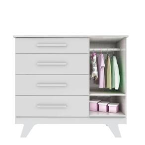 A Cômoda Retrô 1 Porta é um produto 100% MDF e possui pintura atóxica. Seu caixote é em chapa de 12 mm, enquanto as frentes e o tampo são em chapa de 15 mm. Seus pés são usinados em uma peça única de MDF 25 mm. Os puxadores são fabricados em MDF revestido com papel melamínico. Possui cabideiro metálico, gavetas com corrediças telescópicas e porta