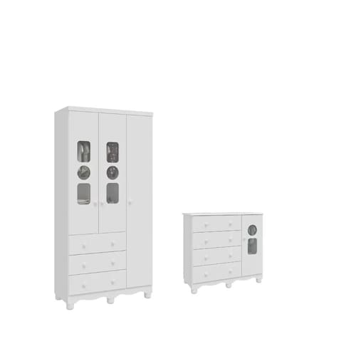 04 gavetas com corrediças metálicas e 01 porta com mini cabideiro.Tampo com bordas laqueadas; Gavetas com corrediças metálicas;