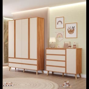 Fabricado em MDF, 04 portas , gavetas com corrediças telescópicas, cantos arrendodados , pés em madeira,pintura atóxica, puxadores cavas, acabamento interno linho, sistema anti tombamento;
