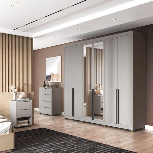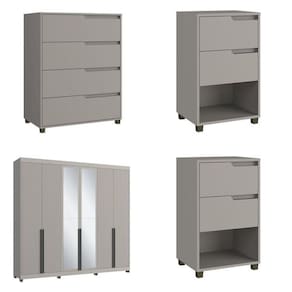 Duas mesas de cabeceira 100% MDF de 15mm, composta por duas gavetas com corrediças teslescópicas, puxadores usinados e nicho. Possui Rodízio: Não Altura do Conjunto: 235 cm Ambiente: null Ambiente Principal: Quarto Cor: Cinza Informação Complementar: 1x Guarda-Roupa 6 Portas de Giro Puxador 100% Mdf Newton CInza/Cinza/Cinza Largura: 250 cm Altura: 235 cm Peso: 240,4 kg Profundidade: 54 cm Necessita Montagem: Sim