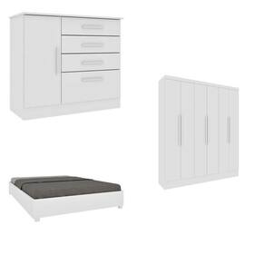 Guarda Roupa 6 Portas 180cm Munique, produto em MDP com espaço de armazenamento extenso e bem distribuído, puxadores em MDF, cabideiros em alumínio, 3 dobradiças de 26cm por porta, 4 gavetas internas com puxadores e corrediças telescópicas, que fornecem maior praticidade e segurança ao produto, possibilitando um deslizamento suave, firme e silencioso, prateleiras para acomodar e organizar suas roupas e objetos. Cama Casal Mônaco, produto em MDP, estrado de madeira reflorestada e ripas multi-laminadas, pés em PVC, dimensões para colchão 1380. Cômoda 1 Porta 4 Gavetas 104cm Chicago, produto em MDP, 4 gavetas com corrediças telescópicas, sapateira na lateral com prateleira, puxadores em MDF, perfil H plástico nas costas, excelente acabamento em filete e pintura UV. Possui Rodízio: Não Acompanha Colchão: Não Altura do Conjunto: 204 cm Ambiente: Quarto Ambiente Principal: Quarto Cor: Neve Informação Complementar: 1x Cama Casal 193cm x 144cm em MDP Mônaco Largura: 144 cm Altura: 36 cm Peso: 28,9 kg Profundidade: 193 cm Necessita Montagem: Sim