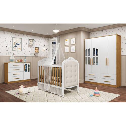 Berço padrão americano 100% MDF Bordas laqueadas Base do colchão c/ 3 opções de altura Varal para mosquiteiro incluso 04 rodízios, sendo 02 com travas