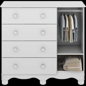 A Cômoda Júnior New 1 Porta é um produto 100% MDF e possui pintura atóxica. Sua estrutura é fabricada em chapa de 12 mm, sendo o seu tampo em chapa de 15 mm. Os pés são injetados em plástico de alta resistência. Possui puxadores plásticos, cabideiro metálico e corrediças apoiadas metálicas. Acompanha dois modelos de rodapés que podem ser definidos no momento da montagem.
