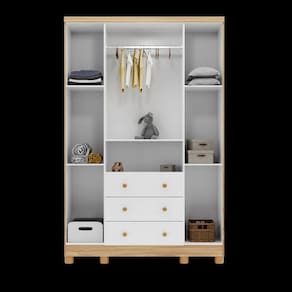 O Armário Júnior New 4 Portas é um produto 100% MDF e possui pintura atóxica. Sua estrutura é fabricada em chapa de 12 mm e seus pés são injetados em plástico de alta resistência. Os puxadores são também em plástico. Os cabideiros são metálicos e suas gavetas possuem corrediças apoiadas metálicas. Acompanha dois modelos de rodapés que podem ser definidos no momento da montagem.
