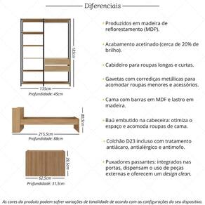 Especificações Técnicas: Dimensões do Closet Montado - Altura: 183cm | Largura: 135cm | Profundidade: 45cm Dimensões da Cama Montada - Altura: 80,5cm | Largura: 215,5cm | Profundidade: 88cm Dimensões do Colchão - Altura: 12cm | Largura: 188cm | Profundidade: 78cm Dimensões da Mesa de Cabeceira Montada - Altura: 39,5cm | Largura: 62,5cm | Profundidade: 31,5cm Material: MDP 15mm Colchão Incluso: Sim Densidade do Colchão: D23 Quantidade de Gavetas: 2 Tipo de corrediça: Metálica