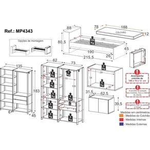 Conteúdo da Embalagem: 1 (uma) Cama 1 (um) Colchão 1 (um) Módulo Closet com Prateleiras 62cm 1 (um) Módulo Closet com Gavetas e Cabideiro 73cm 1 (uma) Mesa de Cabeceira Manual de Montagem Kit Ferragem