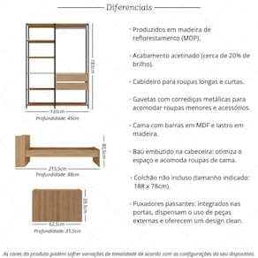 Produzido em MDP de 15mm com acabamento acetinado (cerca de 20% de brilho), este quarto garante durabilidade e facilidade na higienização dos móveis. A cama, com barras de MDF e lastro de madeira, oferece e resistência para até 100kg. Além disso, o baú embutido em sua cabeceira permite guardar roupas de cama, otimizando o espaço do seu quarto. NÃO acompanha colchão (tamanho indicado do colchão: 188x78cm).