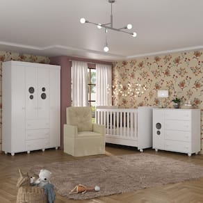 Conteúdo da Embalagem: 1 (um) Berço 1 (um) Guarda-Roupa 1 (uma) Cômoda 1 (uma) Poltrona Kit Ferragem Manual de Montagem