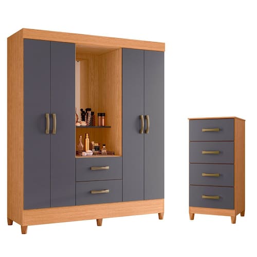 Quarto Completo Guarda Roupa 4 Portas Capela Com Espelho e Cômoda Mobi