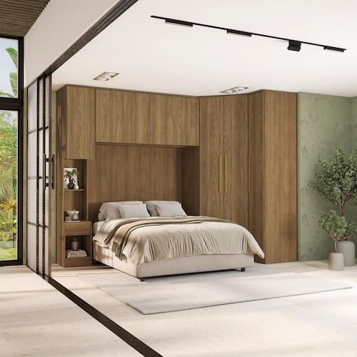 Com nichos de tamanhos diferentes, você poderá guardar calçados e roupas dobradas. Os cabideiros, metálicos e de suporte interno, são perfeitos para organizar peças maiores, como casacos e vestidos sem amassar. Já as gavetas, com corrediças telescópicas, são perfeitas para acessórios e peças menores, deixando seu espaço sempre organizado. Além disso, os aéreos otimizam espaço na vertical, enquanto o painel garante o acabamento de um quarto planejado.