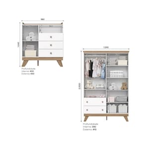 Quarto de Bebê com Guarda Roupa 4 Portas e Cômoda 3 Gavetas Lola Henn, a cômoda é uma peça moderna e funcional, feita em MDF/MDP, com gavetas de deslize suave e uma porta usinada. É ideal para quem busca praticidade em um espaço compacto. Também apresenta o Guarda Roupa Infantil, espaçoso e elegante, com gavetas com corrediças telescópicas, cabideiro em alumínio e portas em vidro, proporcionando sofisticação e otimização de espaço, completando o design com pés em MDP de 25 mm.