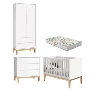 Quarto de Bebê 2 Portas e Cômoda Gaveteiro New Classic Branco com Pés Madeira Natural e Colchão Gazin Reller