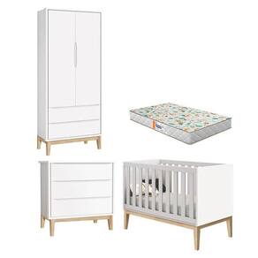 Quarto de Bebê 2 Portas e Cômoda Gaveteiro New Classic Branco com Pés Madeira Natural e Colchão Gazin ? Reller