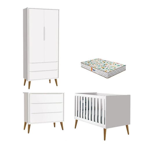 Quarto de Bebê 2 Portas e Cômoda Gaveteiro Theo Branco Pés Amadeirados com Colchão Gazin – Reller