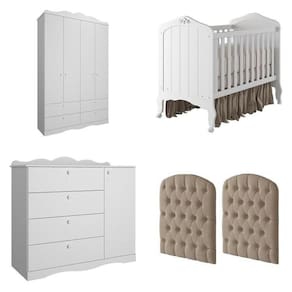 O Berço com Capitonê, estilo provençal desse berço é marcante e muito clássico remetendo todo o romantismo e beleza da época. As cabeceiras recebem apliques estofados em estilo capitonê (peça acolchoada feita com espuma, tecido e botões) que são fixados diretamente nos painéis. É fabricado com matéria-prima 100% MDF, um material ecologicamente correto e de ótima durabilidade e resistência. É um produto sinônimo de SEGURANÇA, pois é fabricado conforme as normas exigidas pela ABNT e certificado pelo INMETRO (Certificação Compulsória de segurança INMETRO). Possui 2 regulagens de altura para o estrado (uma mais alta para quando o bebê é bem novinho e ainda não consegue sentar e outra mais baixa para quando o bebê já se movimenta e consegue ficar sentado). Atenção para a altura do colchão que não pode passar de 12cm. Suas 2 grades laterais são fixas para maior segurança e a régua superior e inferior são fabricadas com MDF de 2,5cm o que proporciona ainda mais segurança. Para facilitar o deslocamento, quando necessário, possui 4 rodízios giratórios, sendo 2 com trava e 2 sem trava. As bordas são todas arredondadas e recebem pintura em laca com tinta atóxica e as peças retas recebem pintura UV também com tinta e verniz atóxicos. Enviamos junto com o berço uma peça de ferro pintado (varão mosquiteiro) que encaixa nas cabeceiras e serve para colocação do cortinado, evitando assim que os pequenos sejam picados pelos mosquitos. Para que consiga usar seu berço por mais tempo, enviamos também uma barra de proteção lateral para que consiga transformá-lo em Berço Cama quando os pequenos já forem maiores. Berço desenvolvido para uso de colchão padrão americano de 0,70x1,30m. Acompanha Colchão: Não Altura do Conjunto: 223 cm Ambiente: null Ambiente Principal: Quarto de Bebê Cor: Branco Cor Predominante: Branco Garantia do Fornecedor: 03 meses Informação Complementar: 1x Guarda-Roupa de Bebê 4 Portas 4 Gavetas Aquarela Branco Largura: 158 cm Altura: 223 cm Peso: 112 kg Profundidade: 48 cm Necessita Montagem: Sim