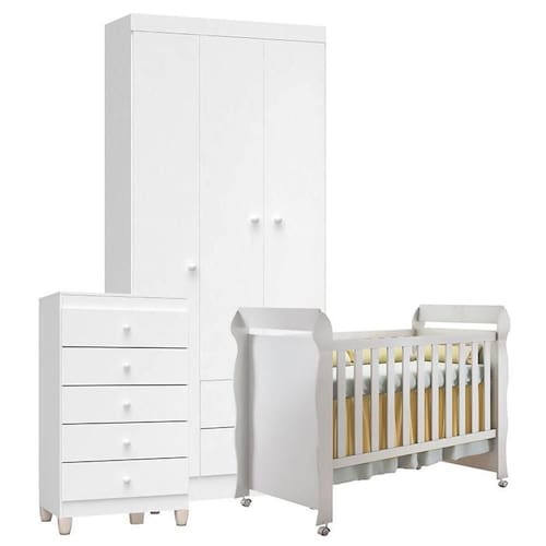 Quarto de Bebê 3 Portas com Gaveteiro Ternura Baby e Berço Mirelle Branco Brilho - Incorplac