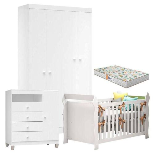 Quarto de Bebê 4 Portas Ternura Baby com Berço Lara Branco Brilho com Colchão Incorplac