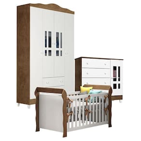 Quarto de Bebê Ariel 4 Portas e Berço Lara Branco Acetinado Amadeirado – Carolina