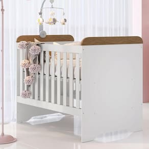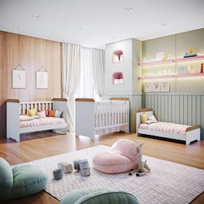 Móveis que se combinam trazem mais harmonia para o ambiente. Produzidos em MDP e MDF de alta resistência mecânica, nossas peças são feitas para durar e acompanhar cada momento com a sua família. O berço multifuncional também pode ser utilizado como mini-cama e mini-sofá. O guarda-roupa 3 portas traz em sua divisão interna cabideiro, prateleiras e gavetas para você organizar de forma prática roupas e acessórios do bebê. Disponíveis nas cores Branco Brilho e Branco Fosco com Amadeirado.