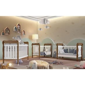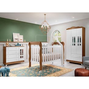 Três peças básicas para você começar a montar o quarto do seu bebê. O guarda-roupa traz toda praticidade e a divisão de espaço interna ideal para você organizar os pertences da criança. A cômoda com porta tem um sistema exclusivo de travas anti-tombamento para garantir toda segurança na hora de trocar o seu baby. E o berço 3 em 1 pode ser aproveitado também como mini-cama e mini-sofazinho. Disponíveis nas cores Branco Brilho e Branco Fosco com Amadeirado.