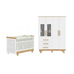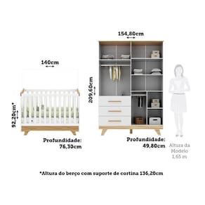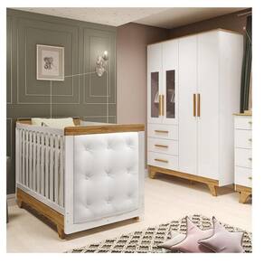 Quarto de Bebê Berço com Capitonê e Guarda-roupa com Janelas 100% Mdf Retrô Kakau Espresso Móveis Branco Brilho/Amêndoa/Branco. Inspirado no estilo retrô do passado com um toque de modernidade a linha Kakau é encantadora. O berço é certificado pelo INMETRO no registro 000781/2018, tem a opção de ser utilizado como mini cama, acompanha um suporte para mosquiteiro e a base do colchão é regulável em 3 opções de altura, aumentando o conforto no uso diário e na segurança com o crescimento do seu pequeno(a). São móveis com acabamento em pintura UV atóxica e com a qualidade de ser produzido em 100% MDF. Tudo para oferecer um quartinho aconchegante, pratico e lindo para o seu bebê. Medidas dos produtos (cm): Berço: 92,20 x 135,50 x 76,30 (AxLxP) Guarda Roupa: 209,60 x 154,80 x 49,80 (AxLxP)